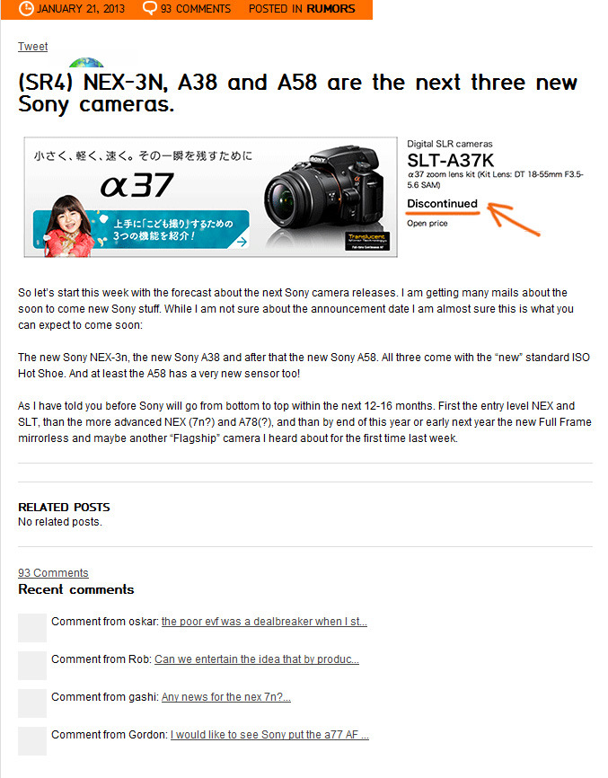 根据国外sonyalpharumors.com网站报道,传闻索尼将在2013年春季发布三款微单™以及单电相机新品,具体型号可能为NEX-3N、A38以及A58。