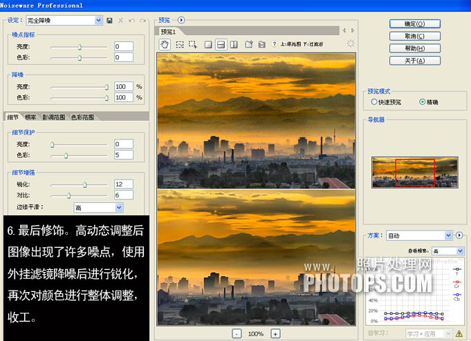 6、HDR处理后图像出现了许多噪点,使用Noiseware Professinal外挂滤镜进行锐化,如上图。
