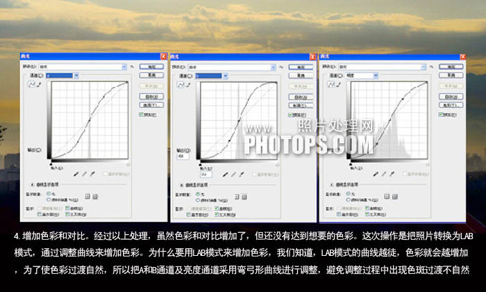 4、增加色彩和对比。进过以上处理,虽然色彩和对比增加了,但还没有达到想要的色彩,这次操作是把照片转换为Lab模式,通过调整曲线来增加色彩,如下图。