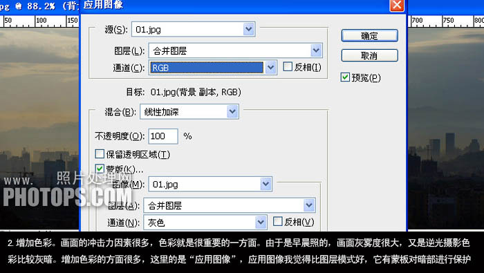 增加色彩的方法有很多,这里使用的是“应用图像”,应用图像比图层模式好,它有蒙版对暗部进行保护。把背景图层复制一层,执行:图像 > 应用图像,参数设置如上图。