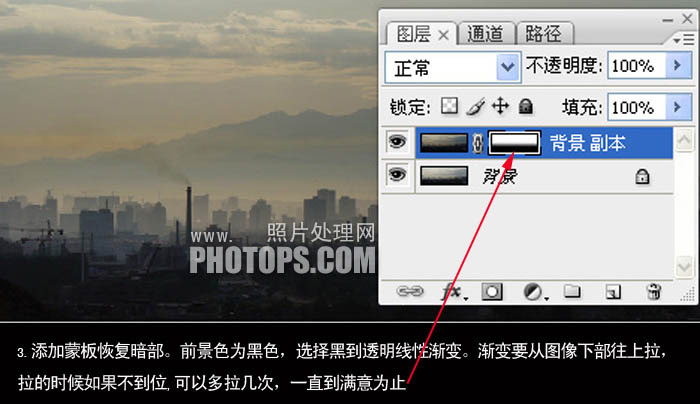 3、添加蒙版恢复暗部,前景色为黑色。选择黑色到透明线性渐变。