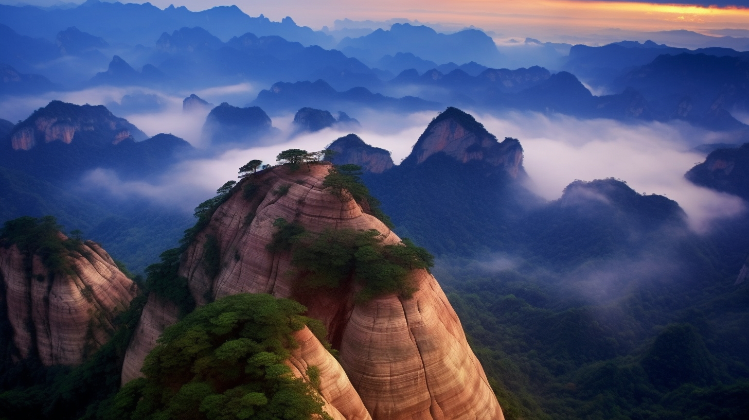 八角寨-崀山曾被《中国地理杂志》之《选美中国》板块评选为中国最美丹霞,被誉为丹霞之魂,群山常年云雾弥漫山风怒号,险崖壁立深谷如坠。通往山顶龙头的50米山脊小径仅宽一尺,两边百米悬崖,其翘角顶端竟有一座山神小庙,道士为香客前往龙头处烧香时惊心动魄的高空行走,这就是崀山一绝“龙头香”。